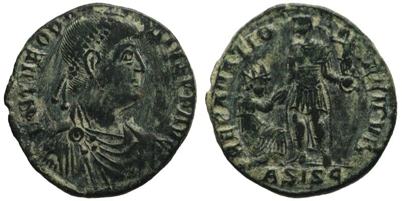 Theodosius I (379 - 395 AD). AE2, Siscia mint 379-383 AD. DN THEODOSIVS PF AVG; pearl diademed, draped and cuirassed bust right / REPARATIO REIPVB; emperor standing right holding Victory on globe and raising kneeling radiate female, ASISC in ex.