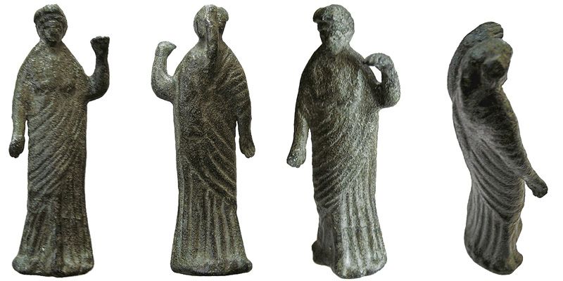 Description: Roman bronze figurine of a woman wearing long sleevless tunic (stola) and a long cloak (palla), raising right hand as a gesture of greeting or farewell; hairstyle indicates a time ca. 1st - early 2nd century AD.