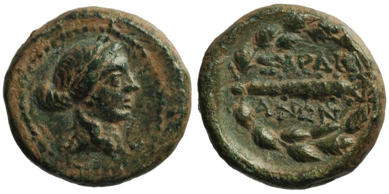 Lydia, Sardes; head of Apollo/club in wreath