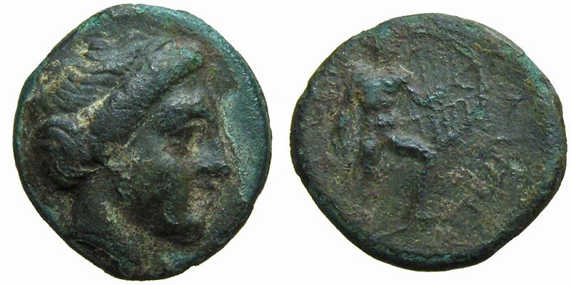 Thessaly, Trikka, 400 - 344 BC. Head of the nymph Trikka to right, with triple-pendant earring and rolled hair / Nude warrior with shield und spear right.