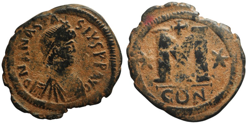 Anastasius I (491-518 AD). AE Follis, Constantinople mint 498-518 AD. D N ANASTASIVS P P AVG; diademed, draped, and cuirassed bust right / Large M, cross above, stars flanking, Γ below, CON in ex.