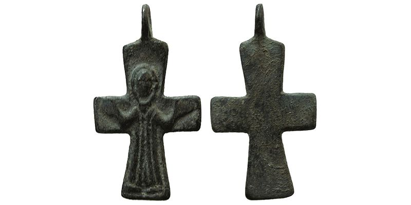 Byzantine bronze cross, 8th - 10th century. Christ with arms upraised "Orans", wearing long robes; with intact loop.