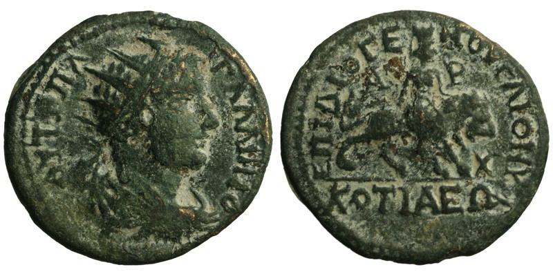 Phrygia, Kotiaion, Gallienus (253 - 268 AD). Diogenes, son of Dionysius, magistrate. ΑVΤ Κ Π Λ ΓΑΛΛΙΗΝΟ; radiate draped bust right / ΚΟΤΙΑΕΩΝ; Kybele riding lion right, Α-Ρ-X in fields; ΕΠΙ ΔΙΟΓΕΝΟΥC ΔΙΟΝΥ.