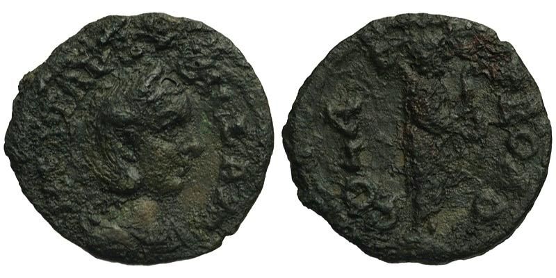 Description: Troas, Alexandria, Herennia Etruscilla (249 - 251 AD). HE ETRVSCILLA AV; diademed and draped bust right / COL AVG TROAD; Apollo Smintheus standing right, with quiver on shoulder, holding patera and bow.