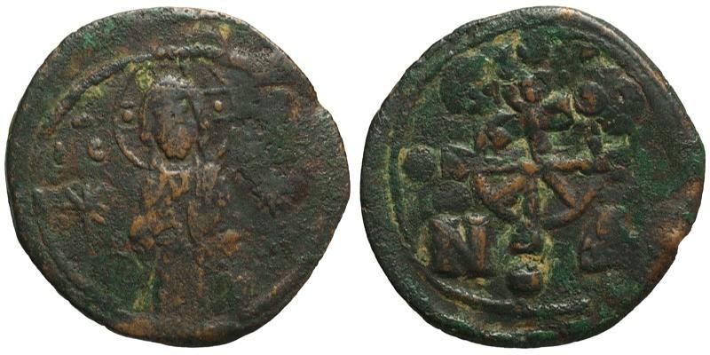 Nikephoros III (1078 - 1081). AE Follis, Constantinople mint. IC-XC to left and right of three-quarter length figure of Christ standing facing, wearing nimbus cross, holding book of gospels and raising right hand, large star to left and right / C-F-N-D in the four corners of a cross with a large dot at the ends of each arm, circle in centre containing large star of eight rays.