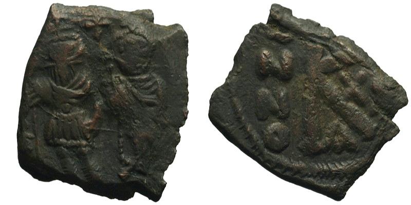 Heraclius (610 - 641 AD). AE Half Follis, Constantinople mint. Heraclius, on left in military dress with long cross in right, and Heraclius Constantine, wearing chlamys holding globus cruciger in right, both stand facing wears crown with cross / Large K, cross above, ANNO left, X... right, A below.