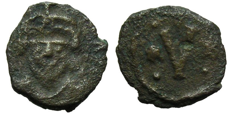 Phocas (602 - 641 AD). AE Pentanummium, Carthage mint. Armoured bust facing wearing crown with pendilia / V between stars with pellets above and beneath.