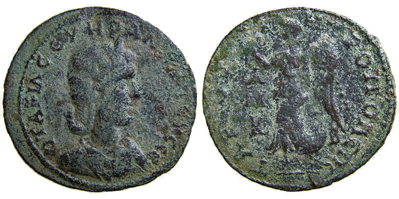 Cilicia, Tarsos, Otacilia Severa, wife of Philip I (244 - 249 AD). ΩΤΑΚΙΛ CEYHPA EYT ΕΥC CΕ; draped bust right / ΤΑΡCΟΥ ΜΗΤΡΟΠΟΛΕΩC; Nike standing left on globe, holding wreath and palm, AMK left, Γ Β in lower right.