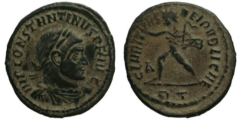 Constantine I (307 - 337 AD). AE Follis, Rome mint 317 AD. IMP CONSTANTINVS PF AVG; laurate, draped and cuirassed bust right / CLARITAS REIPVBLICAE; Sol advancing left, chlamys flying out behind, holding whip and raising right hand, A in left field; RT in ex.