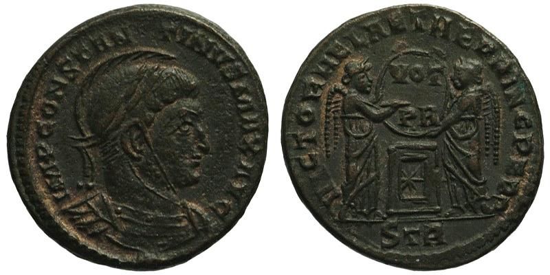 Constantine I (306 - 337 AD). AE3 Treveri mint 319 AD. IMP CONSTANTINVS MAX AVG; helmeted, laureate and cuirassed bust right / VICTORIAE LAETAE PRINC PERP; two Victories holding shield inscribed VOT PR over altar, star within altar; STR in ex.