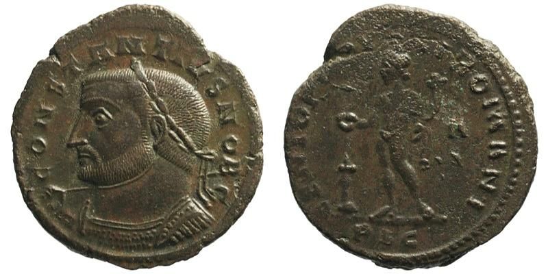 Constantius I (Caesar 293 - 305 AD). AE Follis, Lugdunum mint 301-303 AD. CONSTANTIVS NOB C; laureate and cuirassed bust left, sceptre over right shoulder / GENIO POPVLI ROMANI; Genius standing left, modius on head, naked but for chlamys over left shoulder, holding patera over altar and cornucopiae, B in right field; PLC in ex.