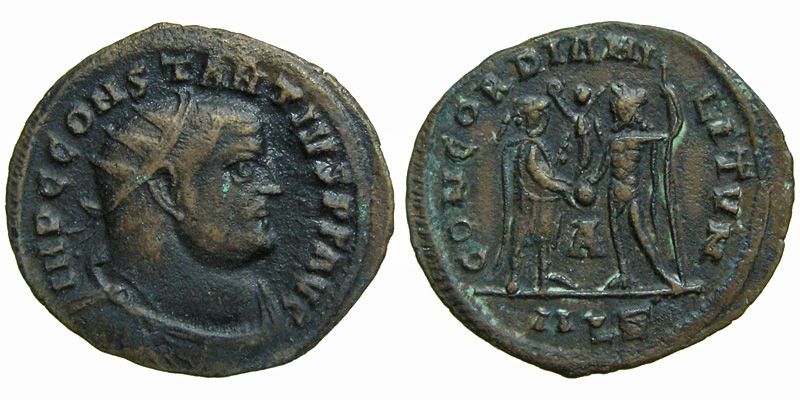 Constantius I as Augustus (305 - 306 AD). AE post-reform radiate, Alexandria mint. IMP C CONSTANTIVS P F AVG; radiate and draped bust right / CONCORDIA MILITVM; Constantius, in military attire, standing right, holding short sceptre and receiving Victory on globe from Jupiter standing left, holding sceptre; A in field, ALE in ex.