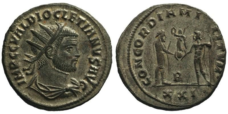 Diocletian (284 - 305 AD). Silvered Antoninianus, Cyzicus 284-294 AD. IMP C C VAL DIOCLETIANVS AVG; radiate, draped and cuirassed bust right, from behind / CONCORDIA MILITVM; emperor stands right, holding parazonium or short scepter, receiving Victory on globe from Jupiter standing left holding long scepter, B in center, XXI in ex.