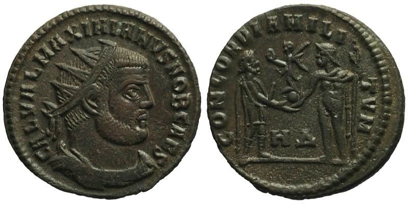 Description: Galerius (Caesar: 293 - 305 AD). AE Radiate, Heraclea mint 295-296 AD. GAL VAL MAXIMIANVS NOB CAES; radiate, draped and cuirassed / CONCORDIA MILITVM; Jupiter presents Victory on a globe to emperor, HΔ in middle field.