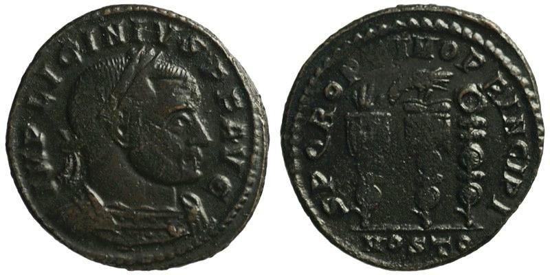 Licinius I (308 - 324 AD). AE Follis, Ostia mint 312-313 AD. IMP LICINIVS PF AVG; laureate, cuirassed bust right / SPQR OPTIMO PRINCIPI; legionary eagle, standing left, between two vexilla with three badges on each, that on the right surmounted by a hand, that on the right by a wreath; MOSTQ in ex.