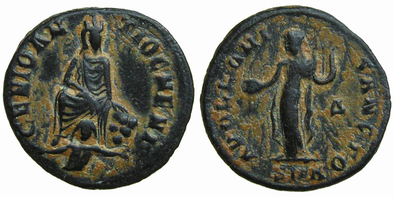 Maximinus II Daia (310 - 313 AD). Anonymous coinage, "persecution issue". GENIO ANTIOCHENI; Tyche of Antioch seated facing on rocks, turreted and veiled, stalks of grain in right, river-god Orontes swimming below / APOLLONI SANCTO; Apollo standing left, patera in right, lyre in left, Δ in right field, SMA in ex.