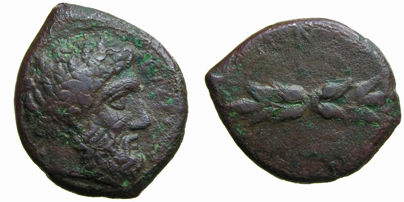 Syracuse, Timoleon; AE Hexas; head of Zeus/thunderbolt