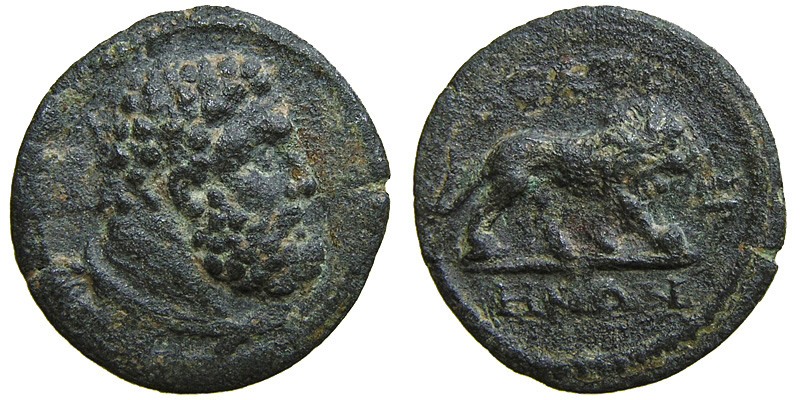 Lydia, Thyateira, 193 - 235 AD. Bare-headed, bearded bust of Herakles facing right, cloak knotted at neck / ΘYATEIPHNΩN; lion stalking right.