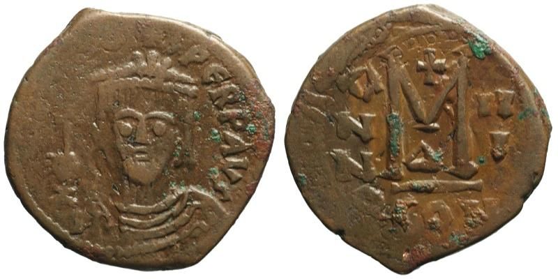 Heraclius (610 - 641 AD). AE Follis, Constantinople mint 602-603 AD (year 3). DN hRACLI PERP AVG; cuirassed, bearded bust facing, wearing crown with trefoil ornament and paludamentum, globus cruciger in right / Large M, ANNO left, III right, cross above, Δ below, CON in ex.