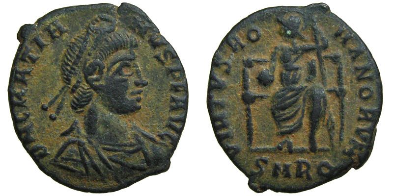Gratian (367 - 383 AD). AE3 Rome mint 378-383 AD. D N GRATIANVS P F AVG; pearl-diademed, draped and cuirassed bust right / VIRTVS ROMANORVM; Roma enthroned facing, head left, holding globe and spear, SMRQ in ex.