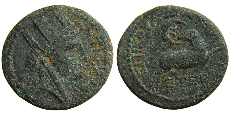Syria, Antioch, 56-57 AD. Veiled and turreted head of Tyche right / Ram leaping right, looking back; star and crescent above, ETEP below.