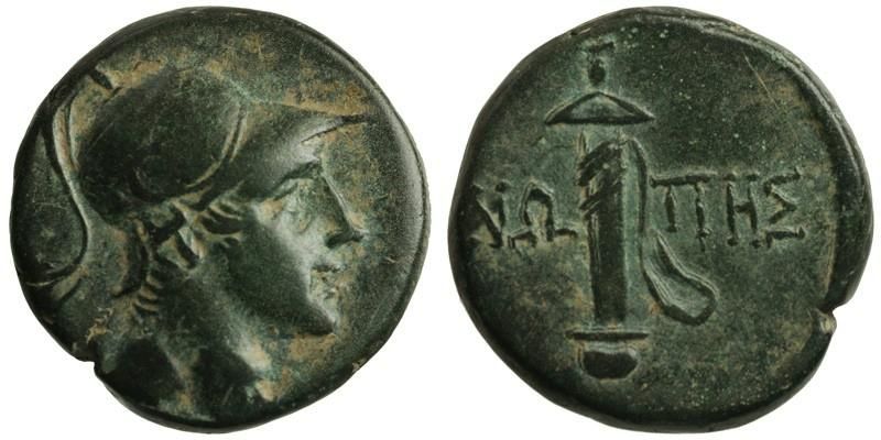 Paphlagonia, Sinope, 193 - 189 BC. Head of Ares right, wearing crested helmet / ΣΙΝΩ-ΠΗΣ; sword in sheath with strap.