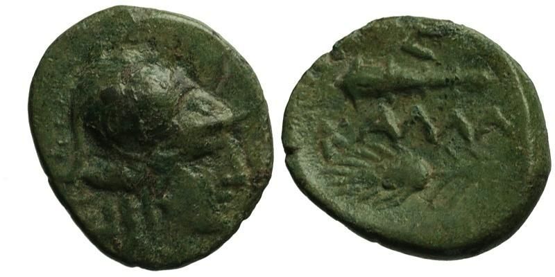 Moesia, Kallatis, 3rd - 2nd century BC. Helmeted head of Athena right / ΚΑΛΛΑ; club and grain ear; monogram above.