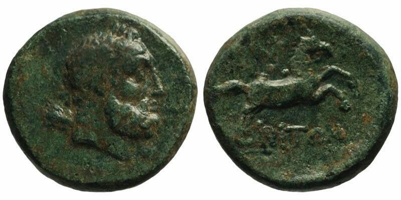 Thrace, Maroneia, 146 BC - 1st century AD. Head of Herakles right with club behind over his shoulder / MAPΩ-NITΩN; bridled horse galloping right, monogram above.