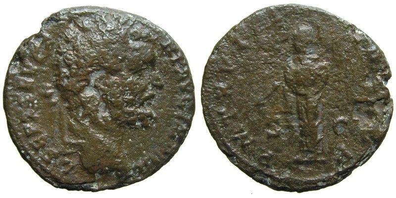 Septimius Severus (193 - 211). AE As, Rome mint 194-195 AD. L SEPT SEV PERT AVG IMP IIII; laureate head right / P M TR P IIII COS II P P; Minerva standing left, holding spear and round shield; S-C in fields.