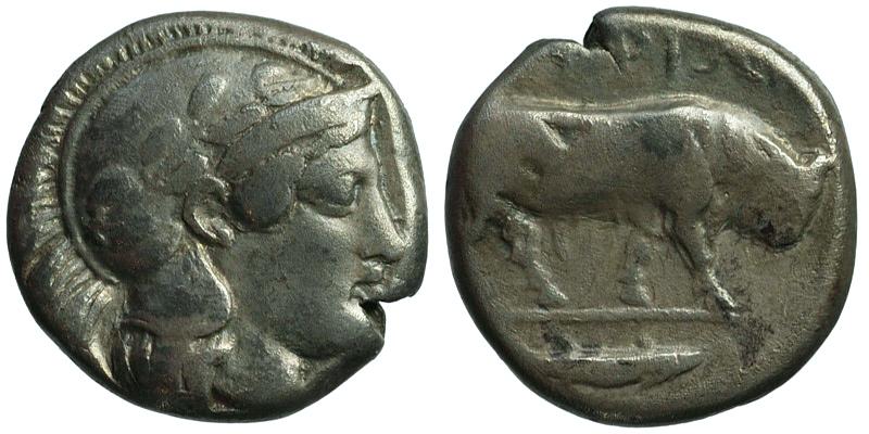 Lucania, Thourioi; AR Nomos; head of Athena/bull