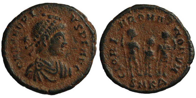 Honorius (393 - 423 AD) AE3 Cyzicus mint 406-408 AD. D N HONORIVS P F AVG; pearl-diademed, draped and cuirassed bust right, star behind / GLORIA ROMANORVM; Arcadius, Honorius and Theodosius II standing facing, each holding a spear; SMKA in ex.