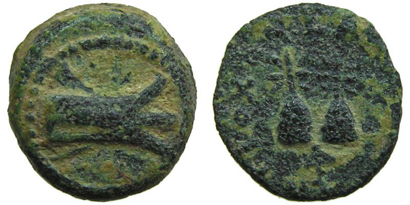 Seleukid Kingdom, Antiochos VII Euergetes (138 - 129 BC). Prow of galley right / ΒΑΣΙΛΕΩΣ ΑΝΤΙΟΧΟΥ; caps of Dioscuri, stars above, monogram (or anchor) below.