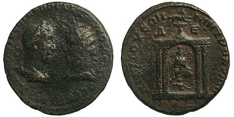 Syria, Seleucis and Pieria, Antioch, Trebonianus Gallus with Volusian (251 -253 AD). AE Octassarion. VTOK K ΓA TΡEB ΓAΛΛOC KAI OVOΛOVCCIANOC CEBB; laureate bust of Gallus right facing radiate bust of Volusian / ANTIOXEΩN MHTΡO KOΛΩN Δ-E; tetrastyle temple of Tyche of Antioch, river-god Orontes swimming at her feet; above shrine, ram leaping right, head left; SC in ex.